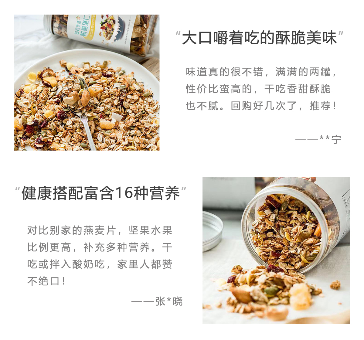 【若初优选】燕麦低温烘焙,保留原味不上火,富含膳食纤维,可当零食和早餐。16种坚果水果比例高达50%!健康美味营养足,老人小孩都能吃。