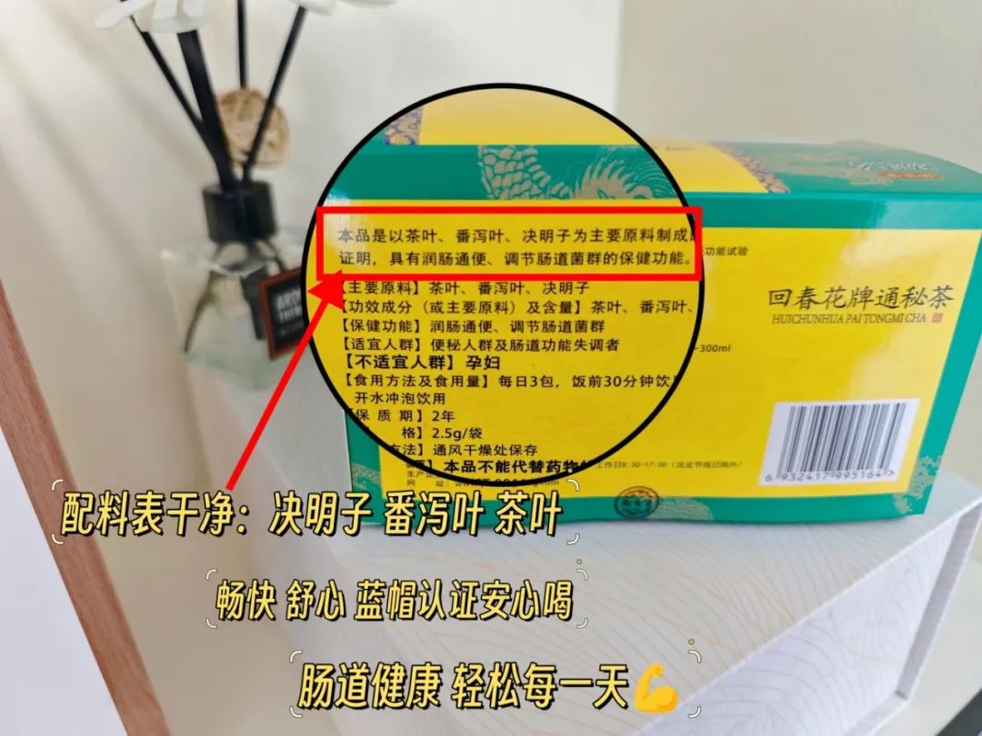 “回春牌通秘茶”采用御生堂中式养生配方,获得药监局蓝帽认证认可,成分温和,品质保障,喝起来健康少负担。