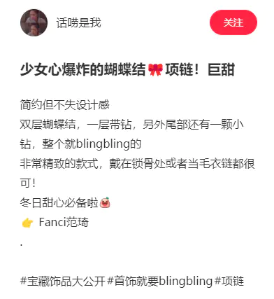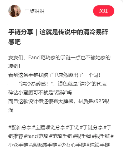 b.多用"戴了半年也不会掉色的手链”“秋天收到的第一条项链”“鞠婧祎同款”这些自带流量的文案