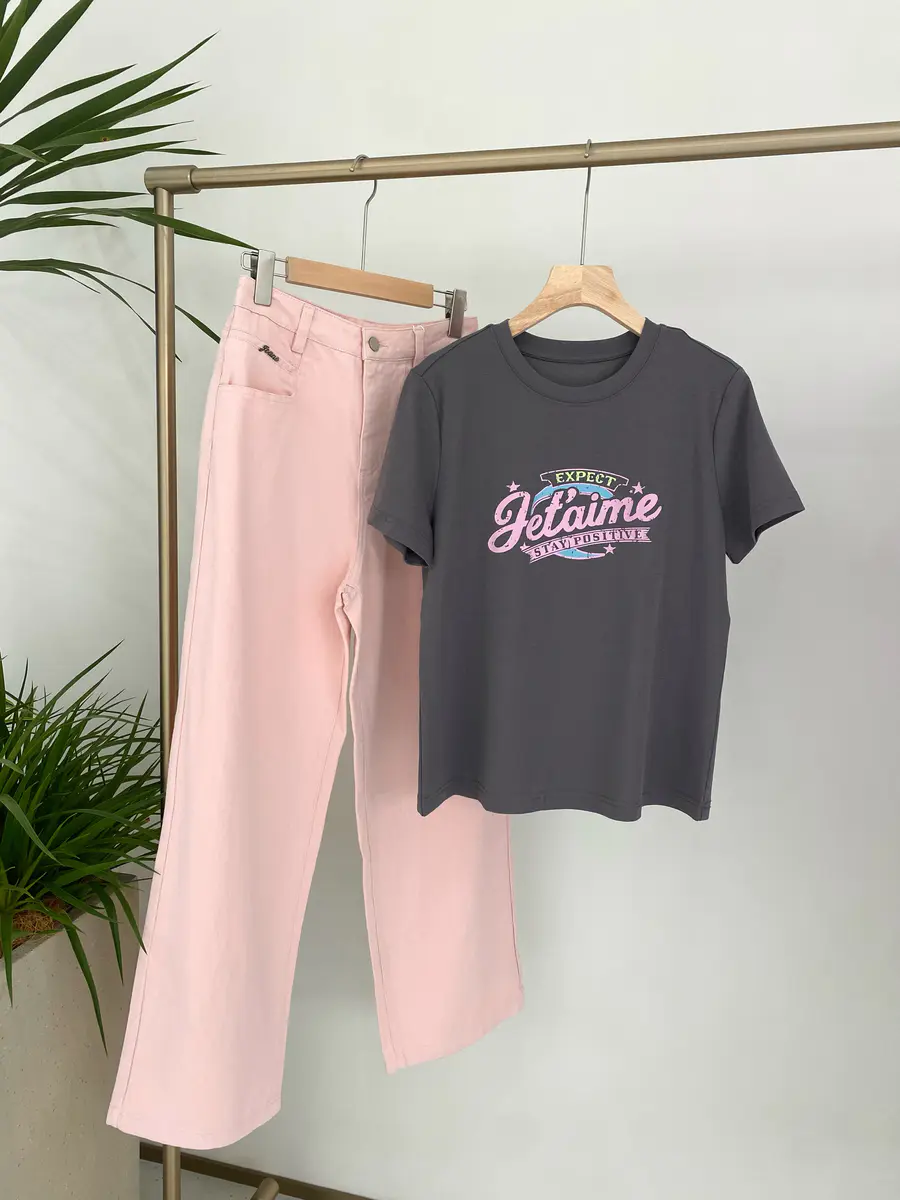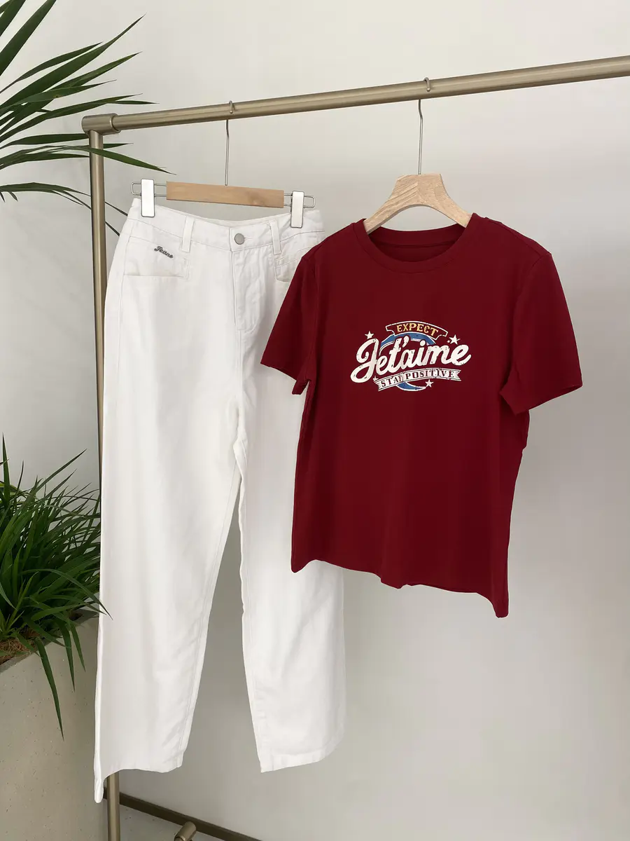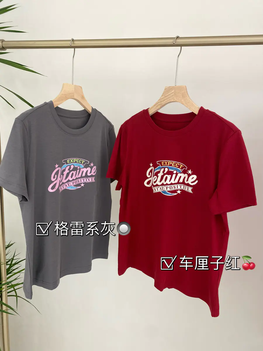 广告字母T,非常有美式复古感,特别选用了比较亮眼的车厘子红,以及灰粉色调,上身很吸睛;