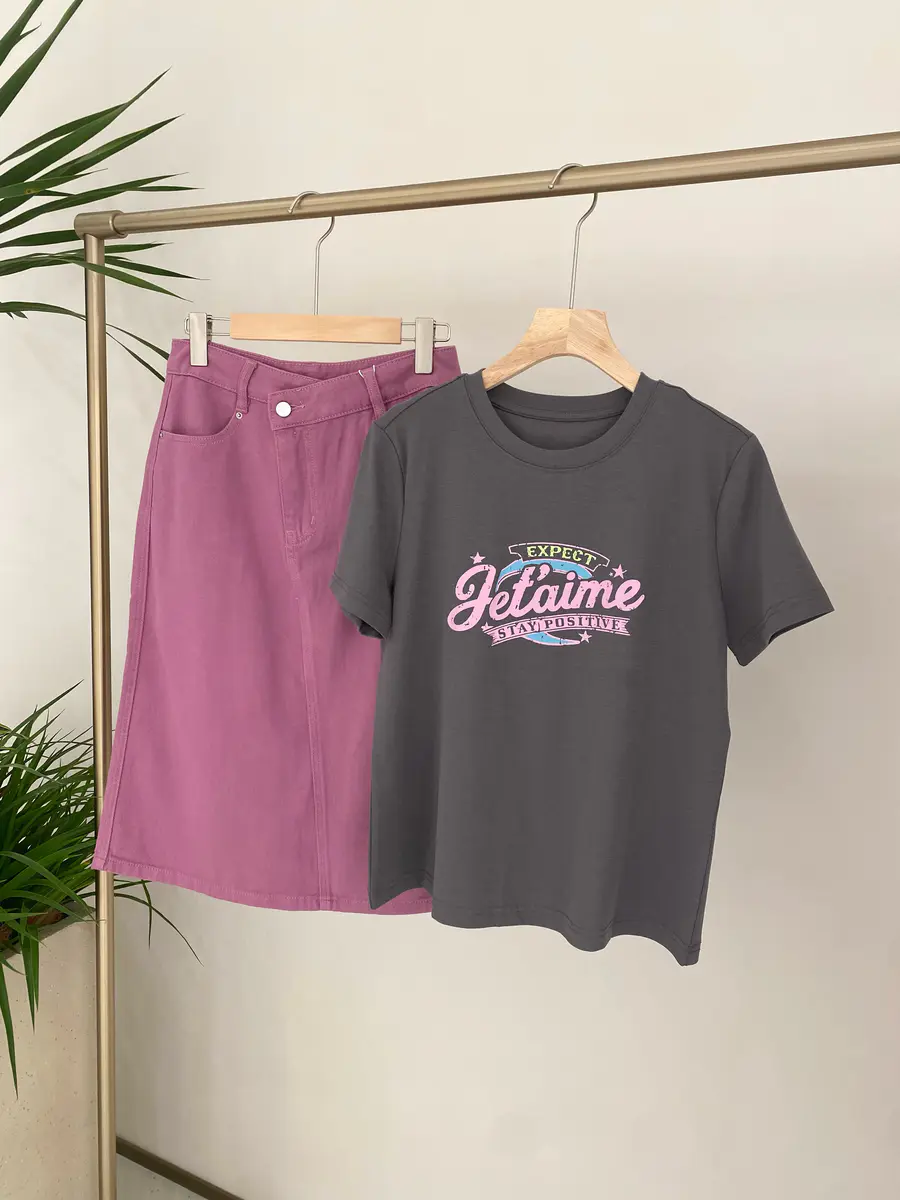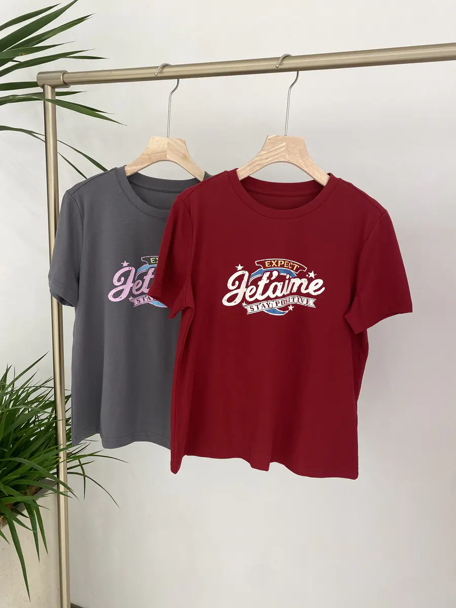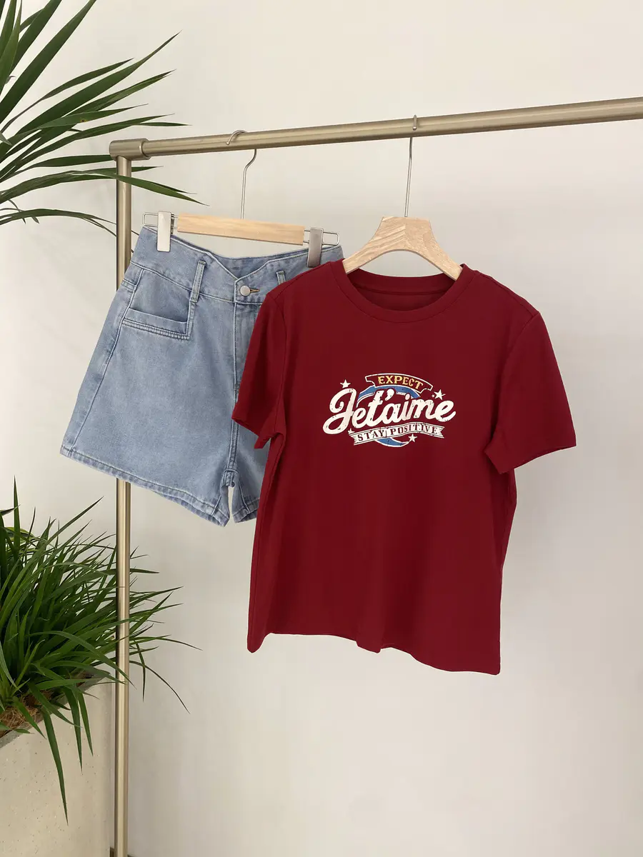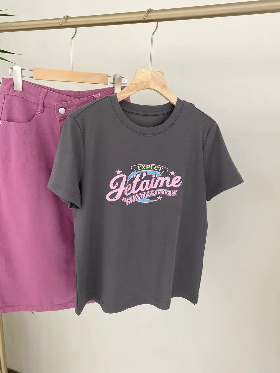 广告字母T,非常有美式复古感,特别选用了比较亮眼的车厘子红,以及灰粉色调,上身很吸睛;