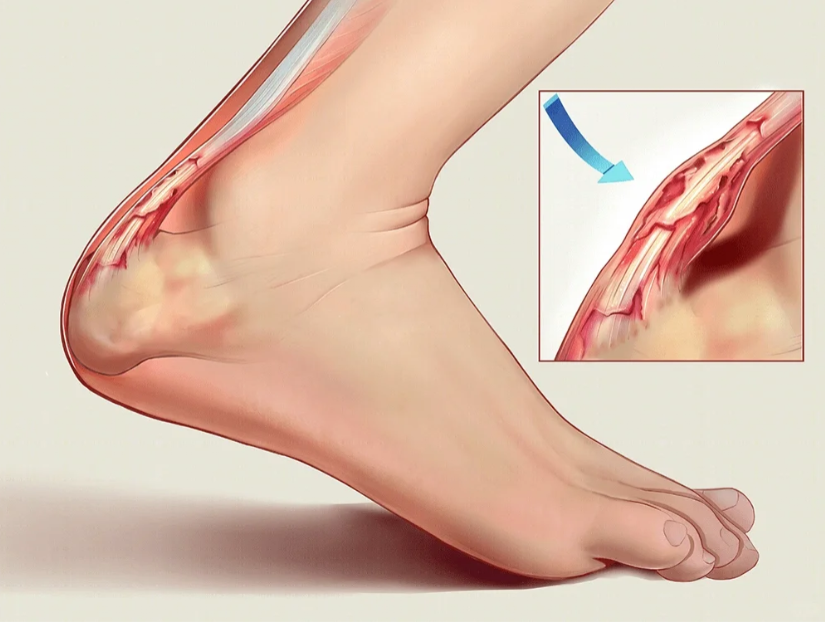 ·疼痛位置:位于脚跟上方的跟腱感到酸痛和僵硬,跑步后疼痛感加剧。通常在剧烈运动后的休息期间或早晨发作,按压肌腱会感到疼痛。急性跟腱炎可能导致红肿和发热。