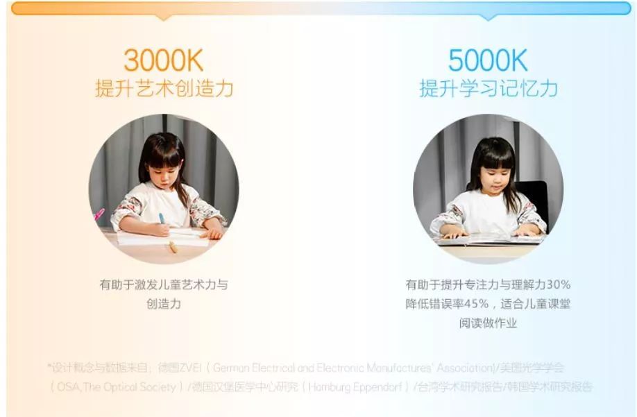 从下图中可以看到,这个范围基本上已经包含了所有孩子学习的情景模式。4000K以上的白光能让精神集中,适合孩子专注学习时用;2700K的暖黄光,拥有极低的蓝光光谱成分,不会影响孩子褪黑素的分泌,能让孩子快速入睡,适合睡前阅读时用。