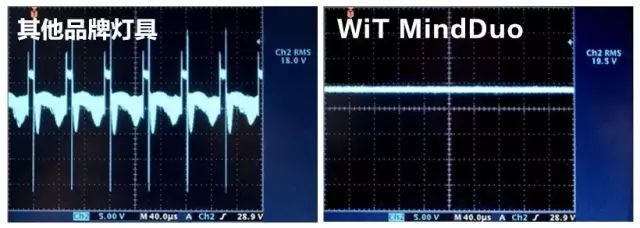 WiT MindDuo智能瞳感台灯在频闪方面的控制也是相当出色。下面一组示波器的图,可以清晰看到,普通台灯上下的浮动非常明显,而MindDuo则接近于一条直线。另外这款灯具同样通过了IEEE(美国电子和电气工程师协会)无频闪认证。