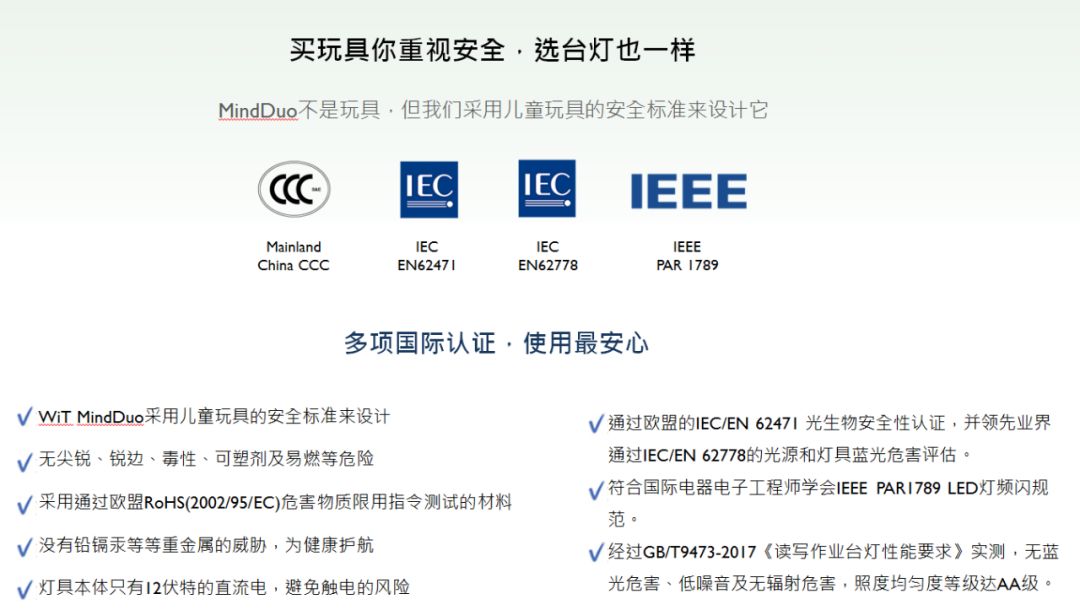 WiT MindDuo智能瞳感台灯保障无蓝光危害,通过了目前国际上唯一监管蓝光危害的认证,并且获得欧盟IEC/EN 62471和IEC/EN 62778的双认证。