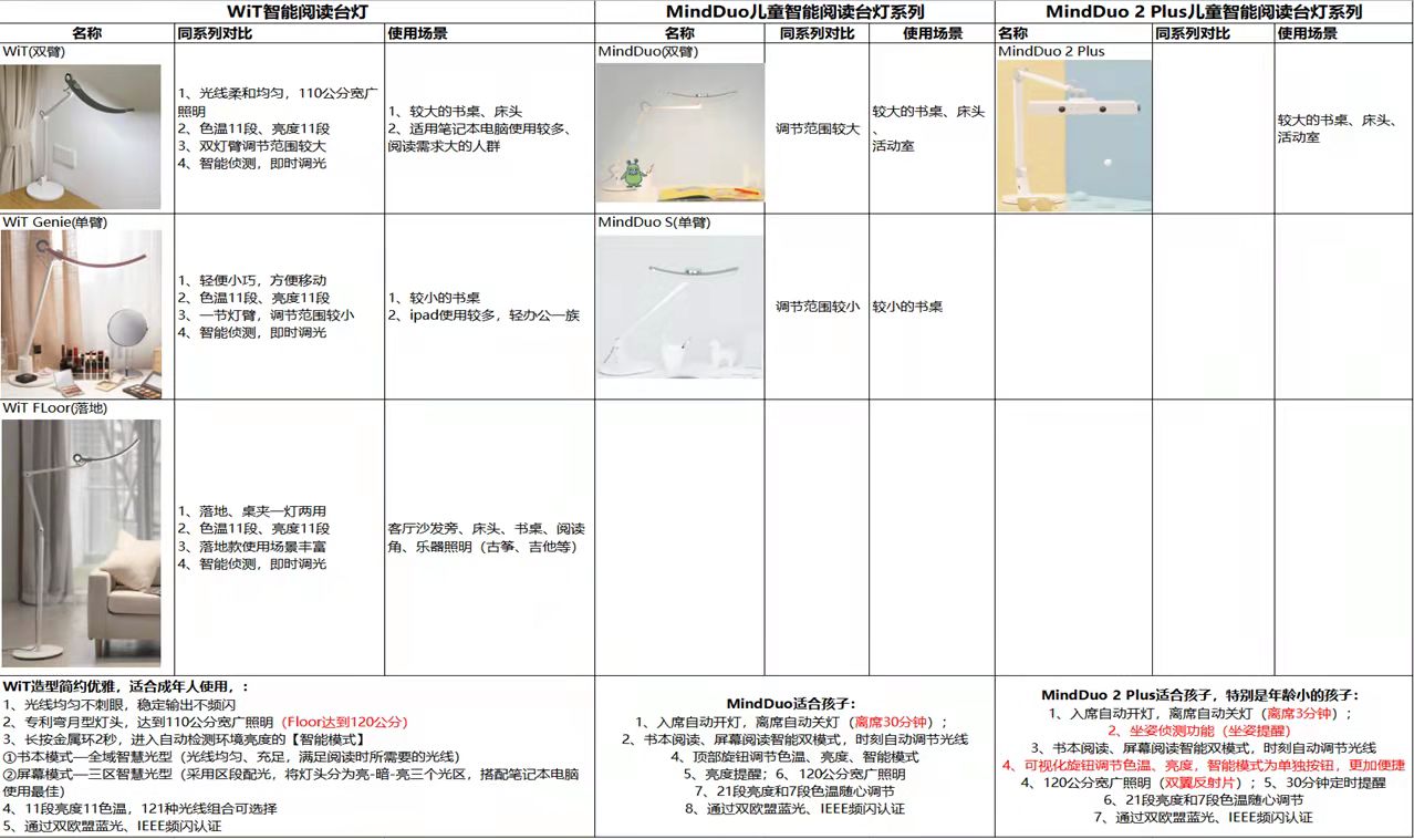 WIT Genie系列:颜值高,带自动调光,不带自动感应开关和阅读30分提醒,照射区域比MindDuo少10cm,可以考虑给大宝和成人的书房卧室或工作区域: