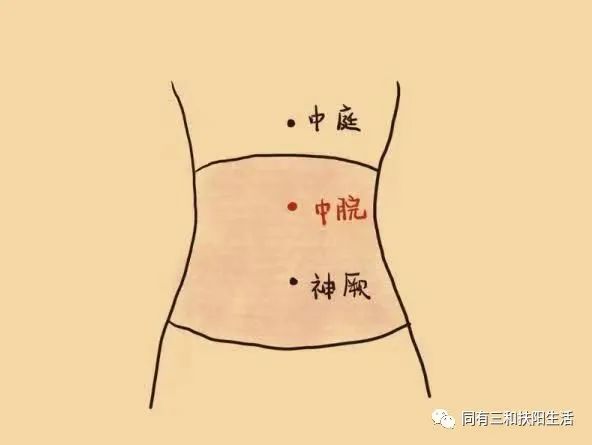 中脘:任脉穴,在胸剑联合至脐中1/2处。