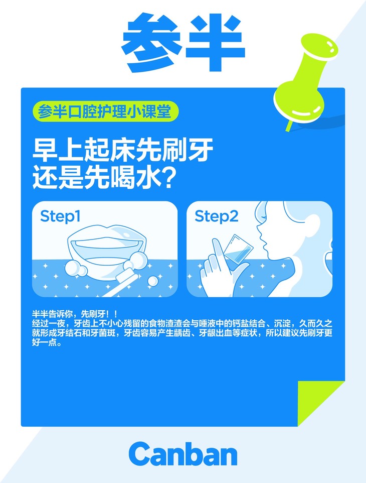 经过一夜,牙齿上不小心残留的食物渣渣会与唾液中的钙盐结合、沉淀,久而久之就会形成牙结石和牙菌斑,牙齿也容易产生龋齿、牙龈出血等症状,所以建议早上先刷牙再喝水更好一点哦。