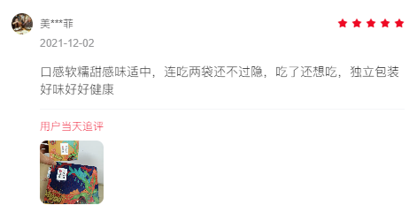 “口感软糯,甜感味适中,连吃两袋还不过瘾,吃了还想吃!”