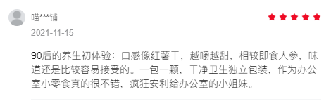“90后的养生体验:口感像红薯干,越嚼越甜,一包一颗,干净卫生,独立包装,当做小零食非常不错!”