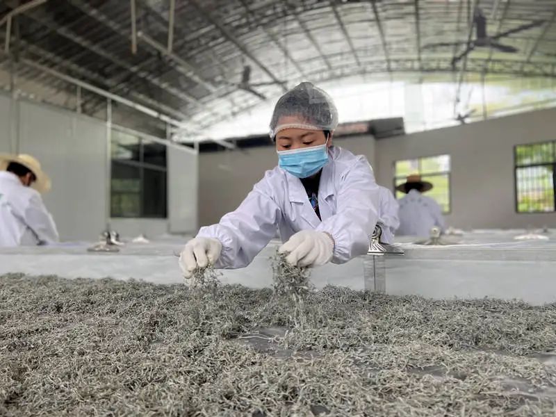 采摘回来的莓茶芽尖还必须进行精心挑选,剔去不符合标准的芽叶,保持芽叶匀整一致。胡蓉说10斤鲜芽叶,最后才能制作1斤成品干茶。