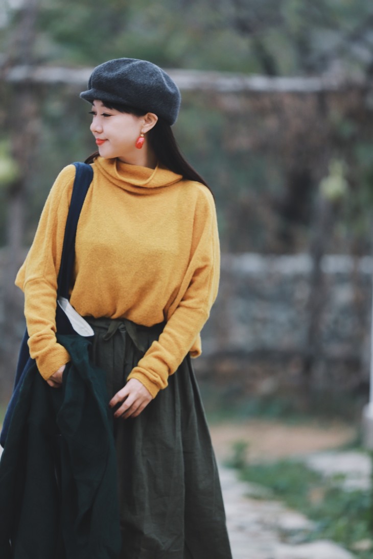 搭配了饱和度很高的黄色毛衫,绿色外套,