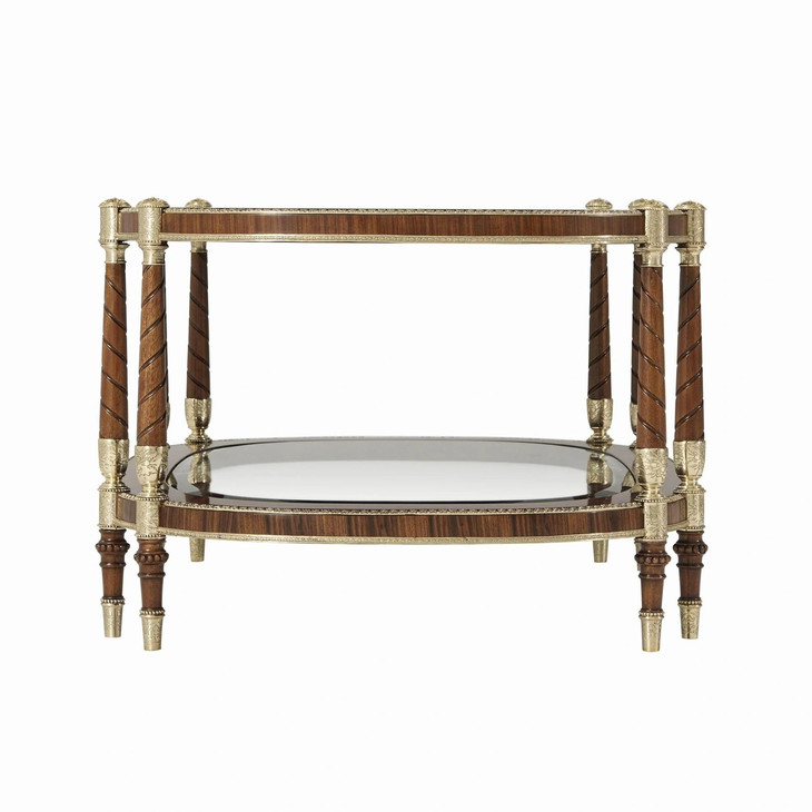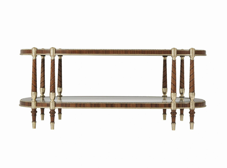 这款英式古典鸡尾酒桌利用木材天然的纹路,切割打磨出各种细巧的图案,在木质平面上再拼接在一起,黄铜铸造细节雕刻,提升质感,创造极为精致典雅的装饰效果。