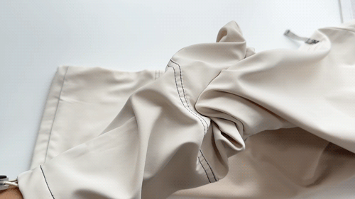 整件衣服的腰带包边、接缝处走线都特别细密平滑,拿着放大镜都找不到多余的线头。