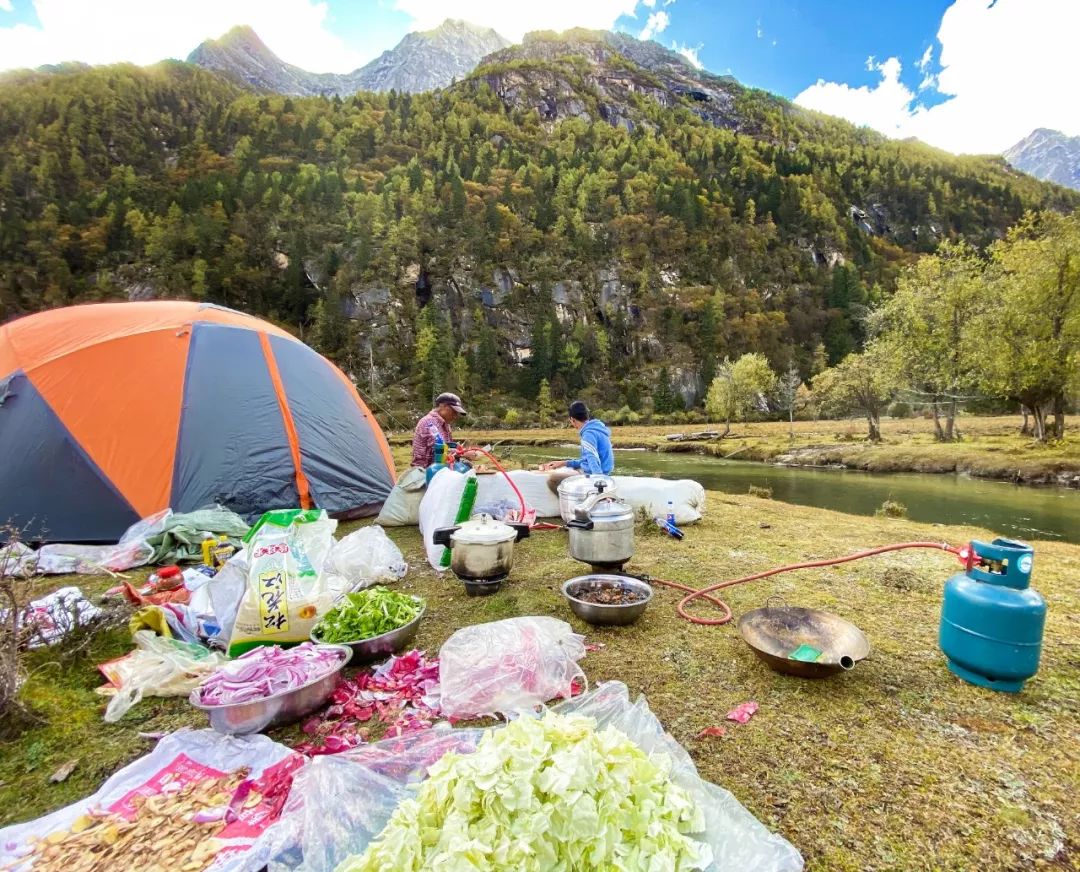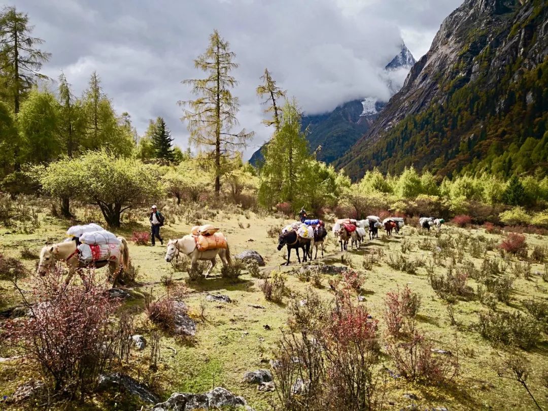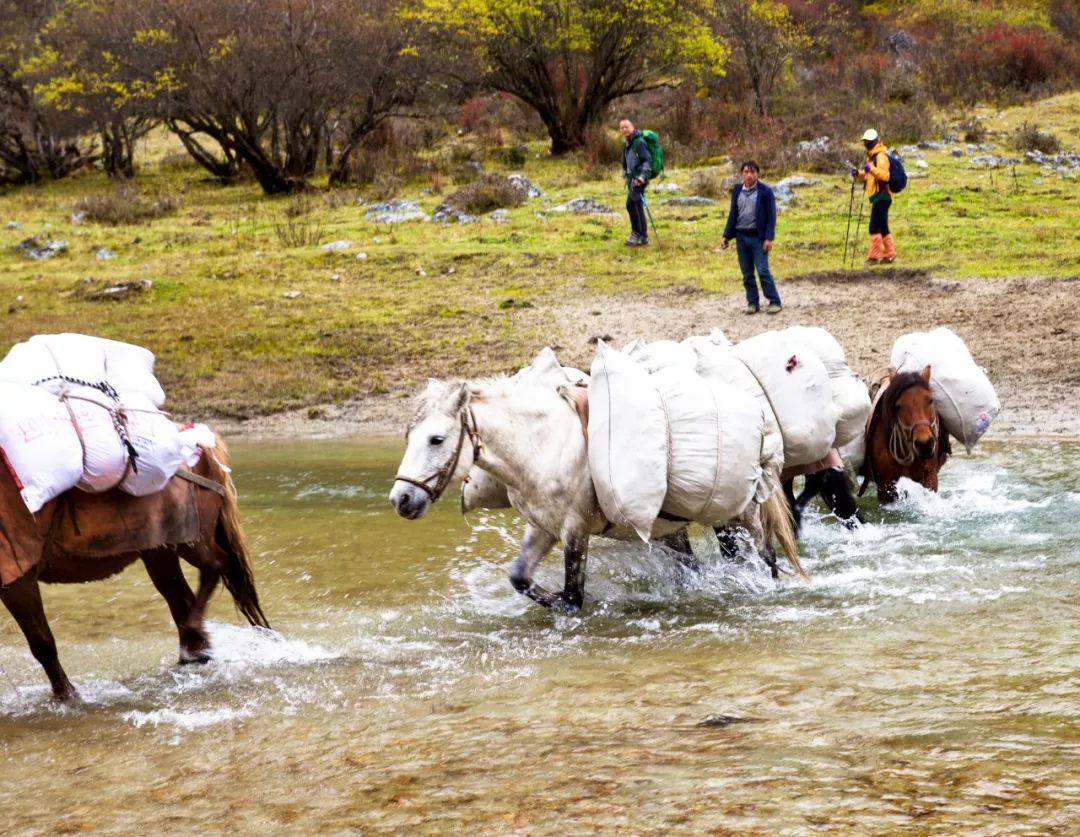 2. 长穿毕线路,一般完整穿越需 3 天时间,可选择轻装模式,即前两天,由马帮运输相关物资(帐篷、营地餐等)及部分行装设备,早晚于营地就餐,中午路餐。但是最后一天马队无法翻越垭口,全部行装需自己背负前行,也可单独请背夫
