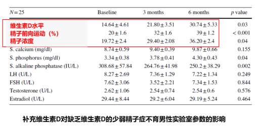 结果发现,随着维生素D的不断补充,维生素D水平增加,精子前向运动率增加,精子浓度增加,即补充维生素D到正常水平有助于改善精子质量。