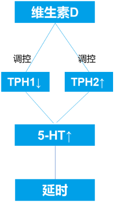 维生素D转化为其生物活性形式发挥出生理作用,色氨酸羟化酶2和色氨酸羟化酶1受维生素D激素的调节,通过TPH2的转录激活和TPH1的抑制,从而影响外周组织(TPH1)中5-羟色胺的产生,以此增加脑中5-HT的生成,从而增加突触间隙内的5-HT浓度而起到延时的作用。