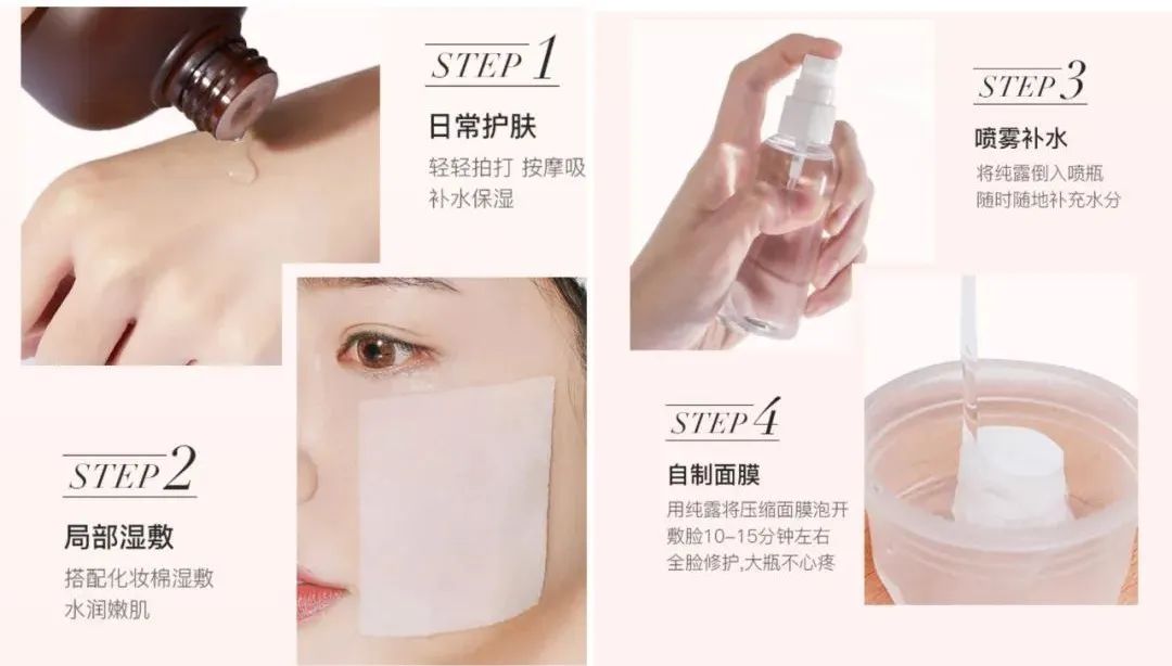 纯露是小分子构成的,以补水为主,渗透性超好,可以深入皮肤底层,起到很好的补水作用。