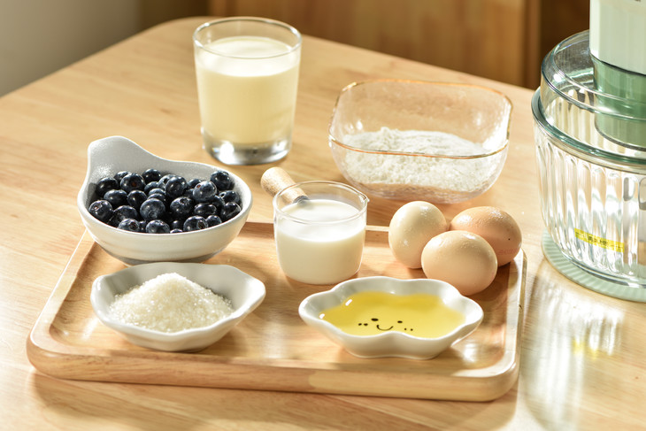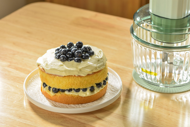 5、将一整盒稀奶油倒入绞肉机中,加入适量的细砂糖,选择 “1档”进行打发。然后将打发好的奶油均匀的涂抹在烤好的 蛋糕胚上,放上蓝莓做装饰即可。