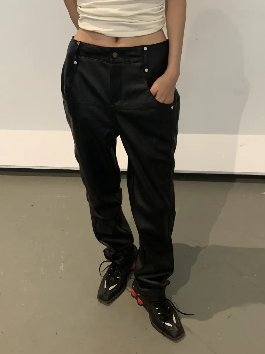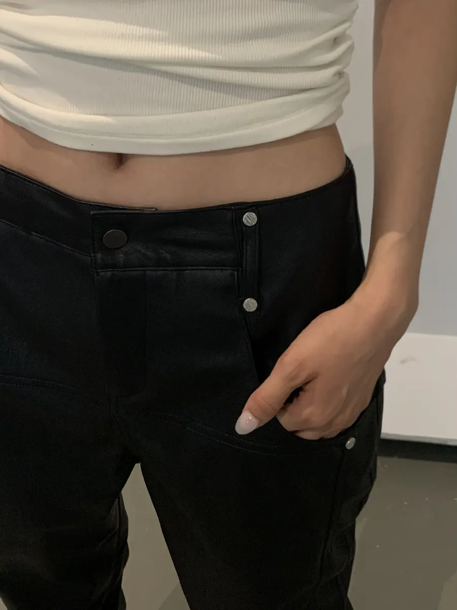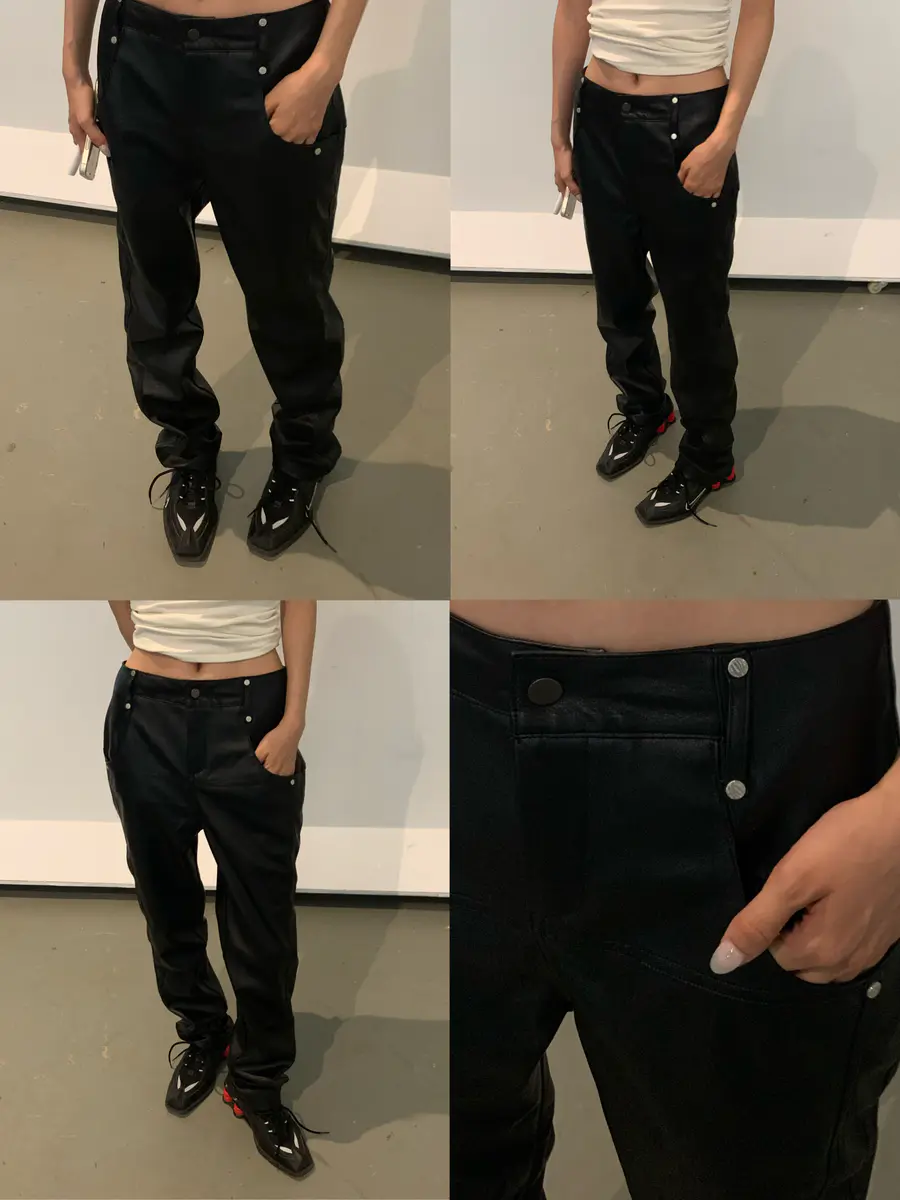 裤子腰头的小金属撞钉增加了该产品的细节装饰感;直筒的版型修身显腿长,是一条万能搭的显瘦皮裤。