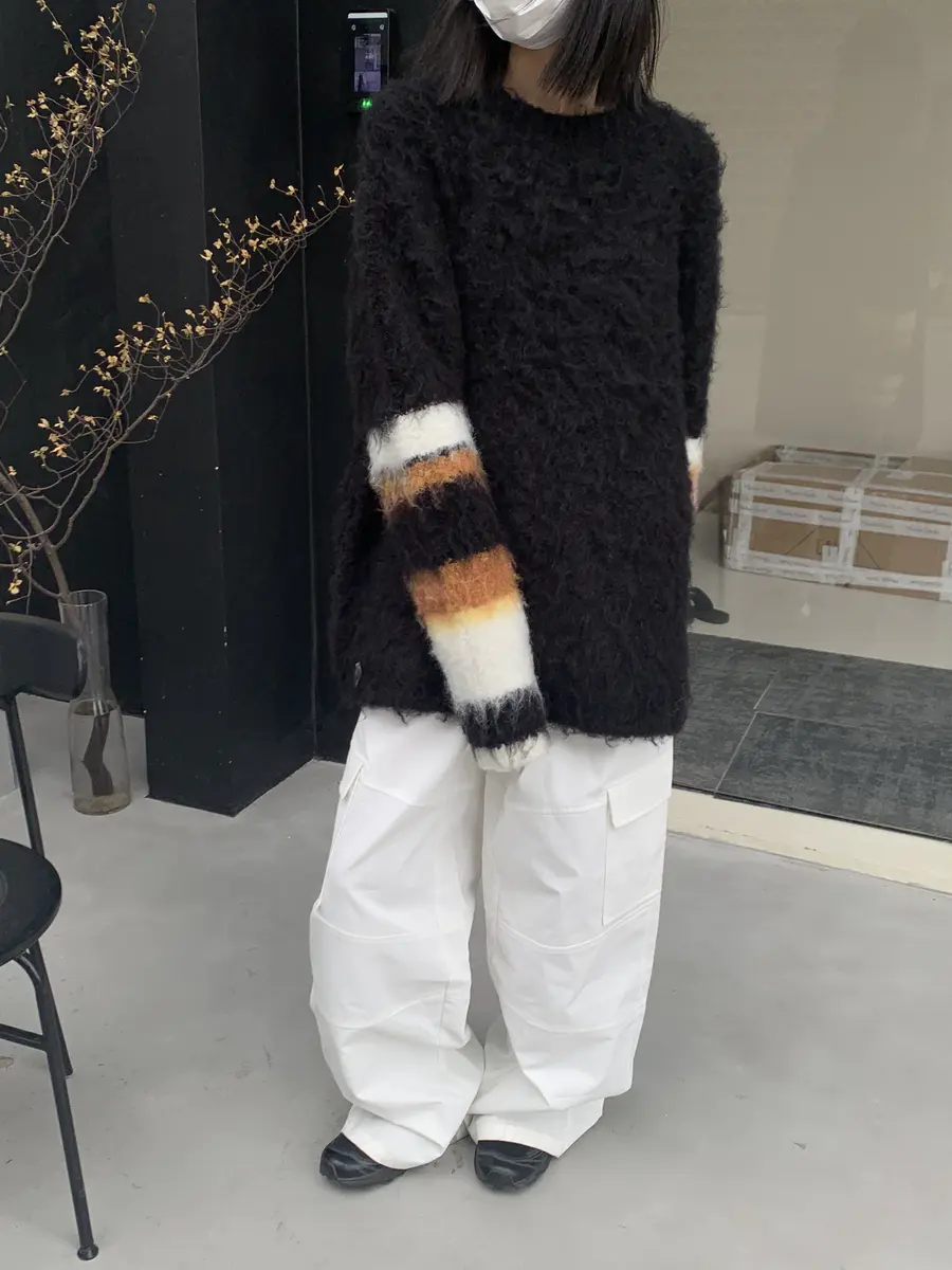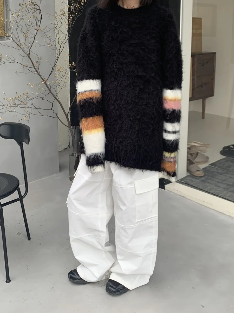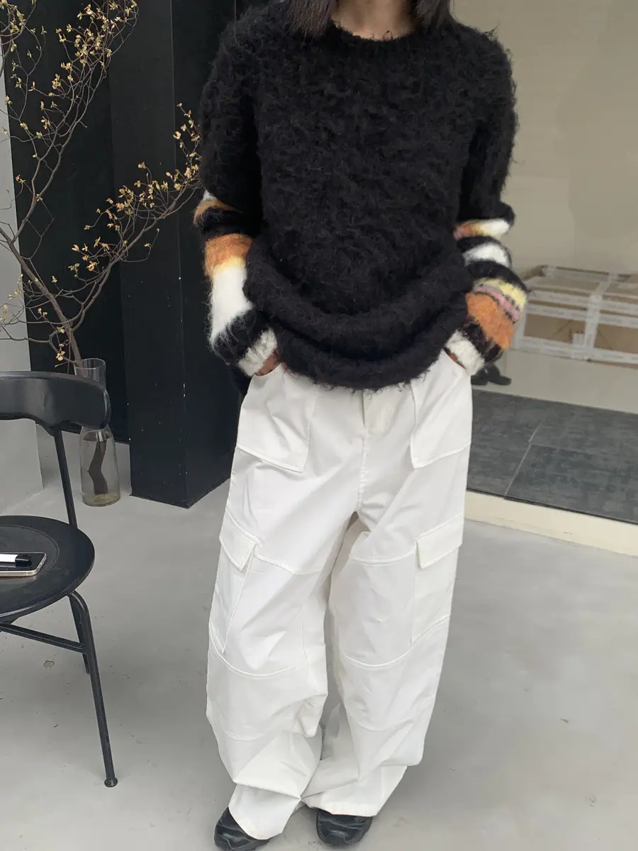 早秋的第一套穿搭,「黑+白」作为主色调绝对不会出错;袖口的彩条中和了黑色马海毛衣单调的感觉,更增加了一丝「俏皮」的感觉。