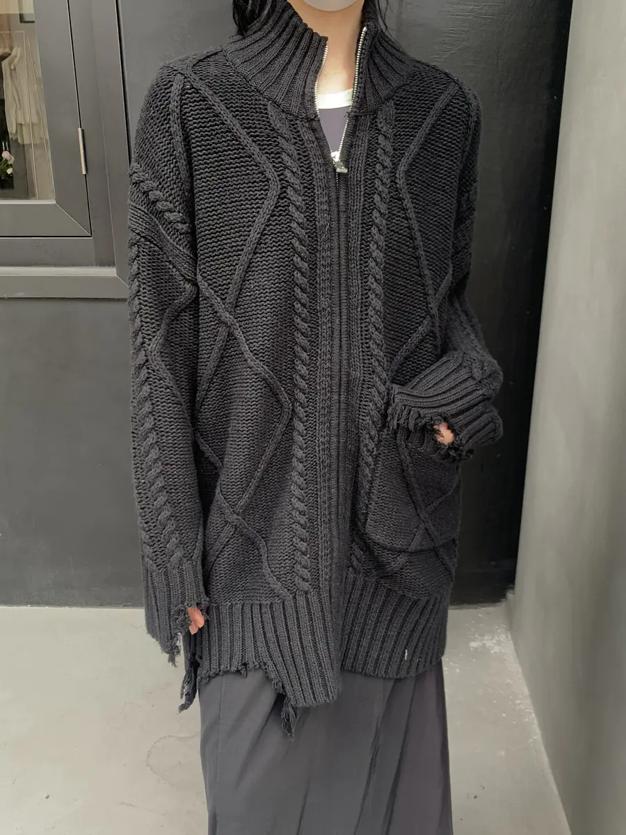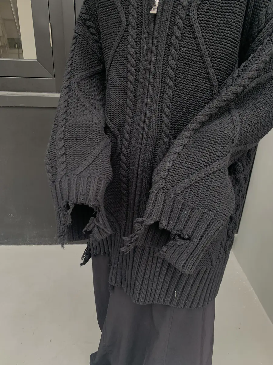 「毛边大口袋」的设计使得「黑色麻花」的衣料不再单调和无聊,给予穿着者一种「破碎慵懒」的穿搭氛围。