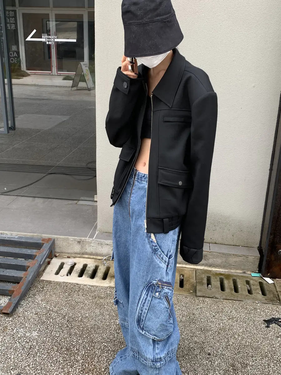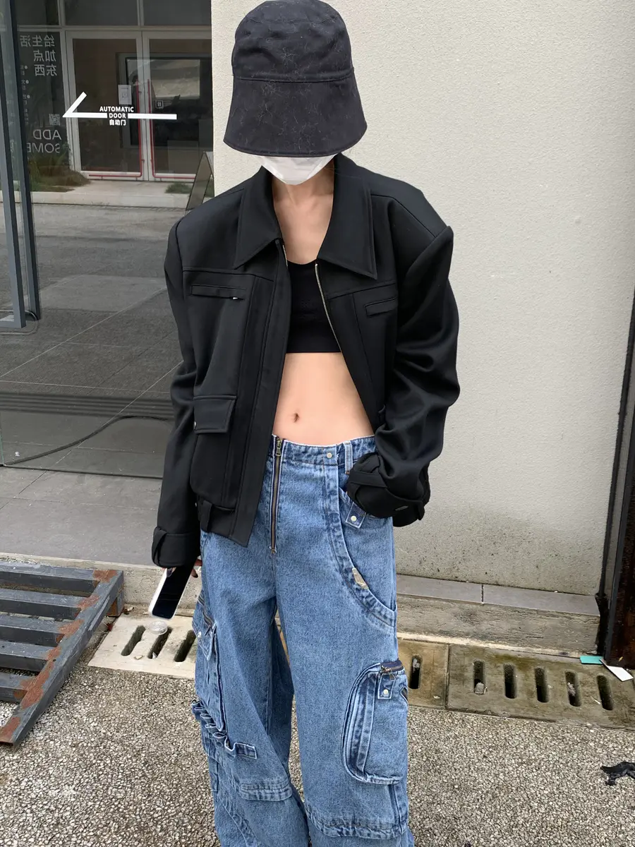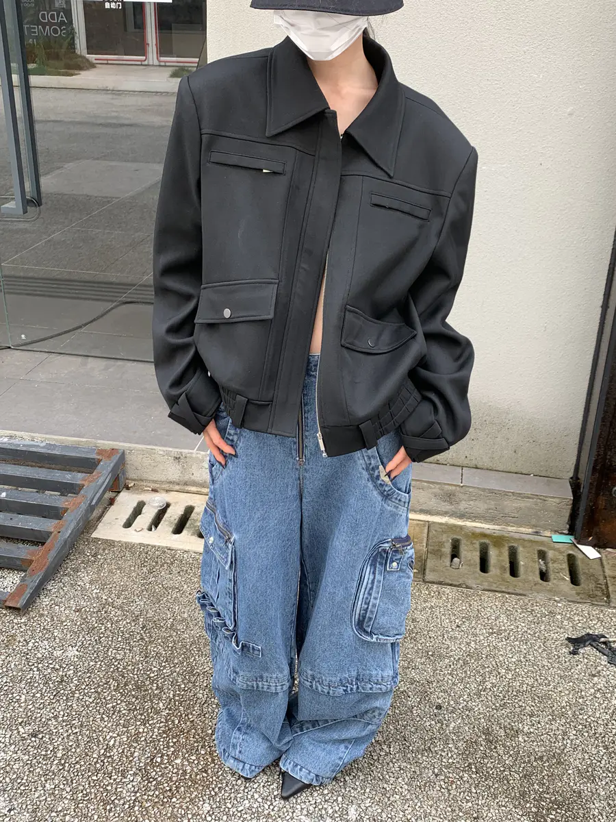 @雕刻空气黑色垫肩多口袋夹克