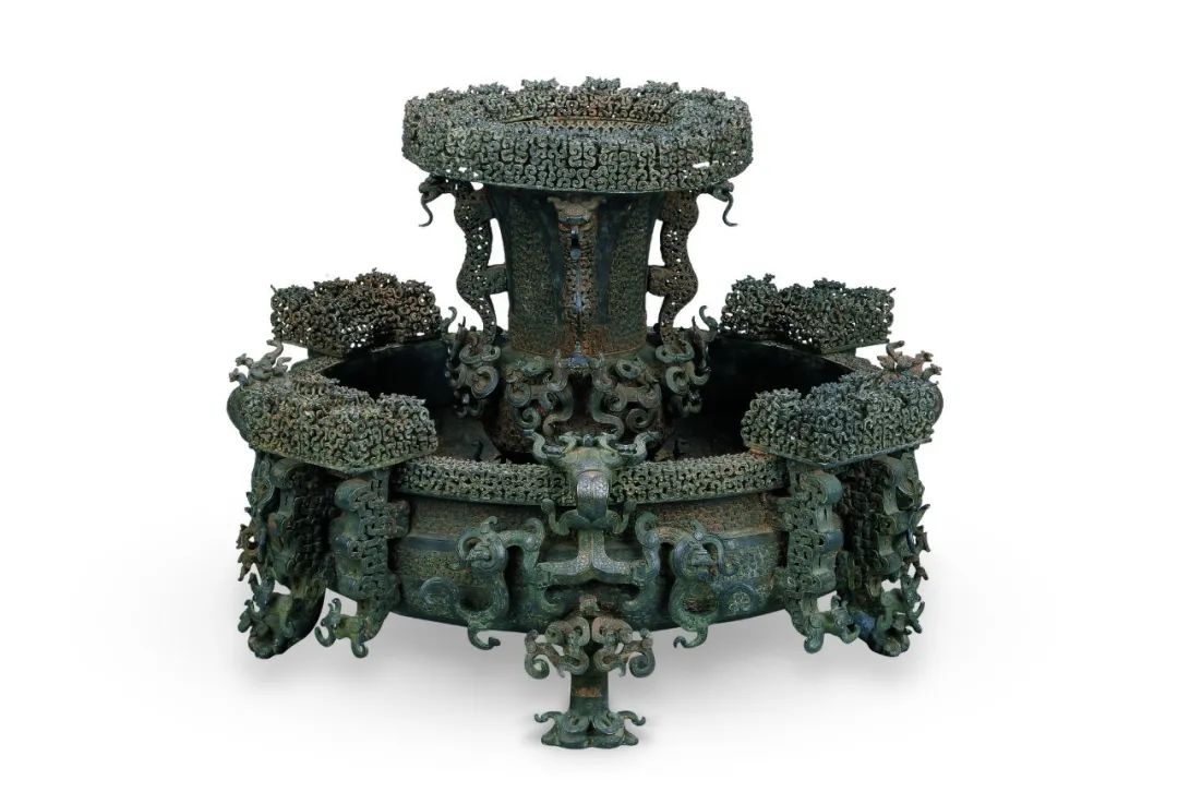 曾侯乙墓是我国目前发掘同类墓葬中最大的竖穴木椁墓,出土文物品类丰富,数量庞大,在一万五千余件出土文物中,仅青铜器就有6239件,其中曾侯乙编钟是迄今发现的最大且最为完整的一套青铜编钟,被誉为中国古代礼乐文明的巅峰之作;纹饰繁复、工艺精美的尊盘,则是战国时期已熟练使用失蜡法进行青铜器铸造的有力证据。