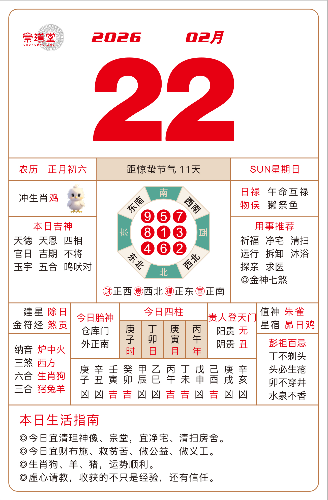 开运小知识:今日卯时(5~7点),早起往东北方散步,纳吉祥之气,迎新春瑞气。