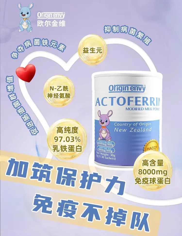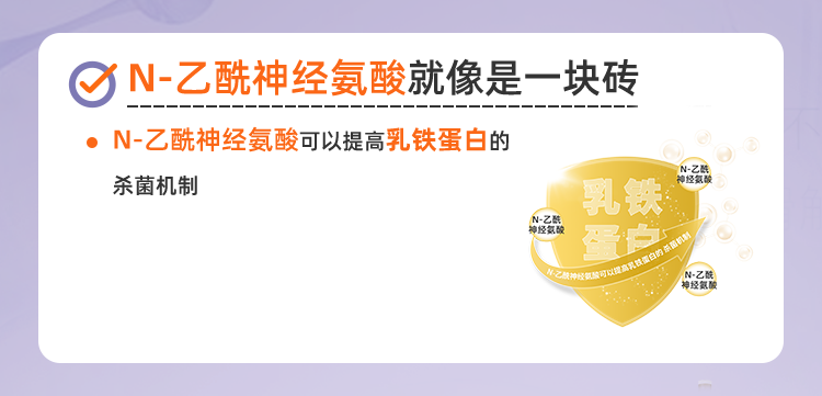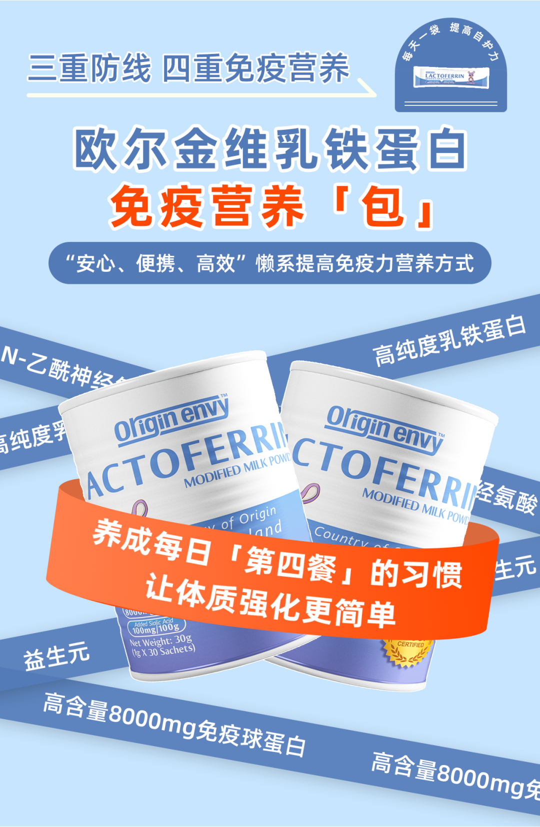 不但甄选高纯度97.03%的乳铁蛋白,而且还添加了高含量8000mg的免疫球蛋白,足足8000mg啊啊啊,可以说是市面上最高含量的免疫球蛋白了,还辅以N-乙酰神经氨酸和益生元,满足每日体质强化需求。