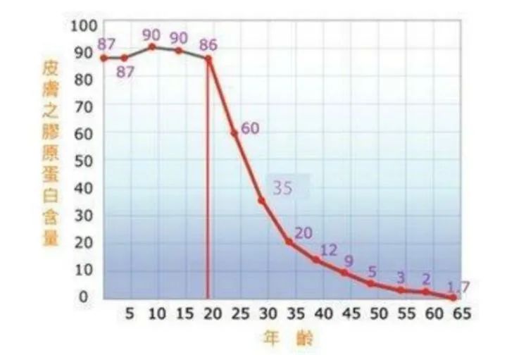 但是25岁以后,胶原蛋白就会迅速流失,40岁时含量已经不到18岁时的一半!