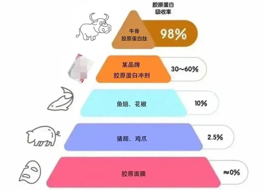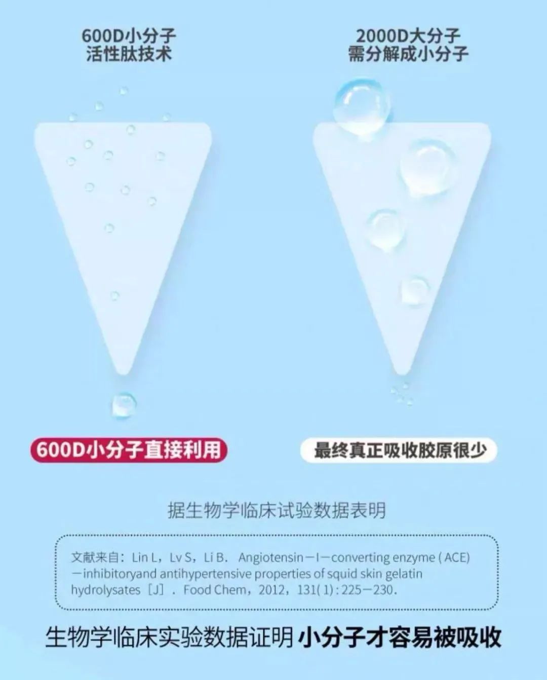 市面上的胶原蛋白剂,分子量多在1000-3000d(道尔顿),在胃里需要转化为小分子蛋白肽后才能被吸收,利用率仅30%~40%。