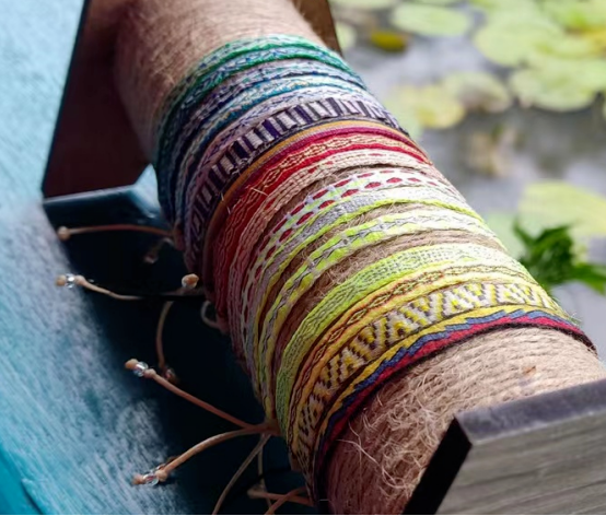 卡织是一种古老的编织技艺,原理为利用综版(卡片)控制经线上下运动变换相邻经线位置,从而织成牢固又美观的绳带类织物。兼具实用与装饰功能。