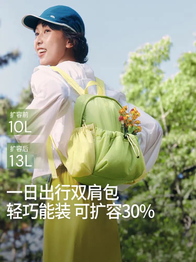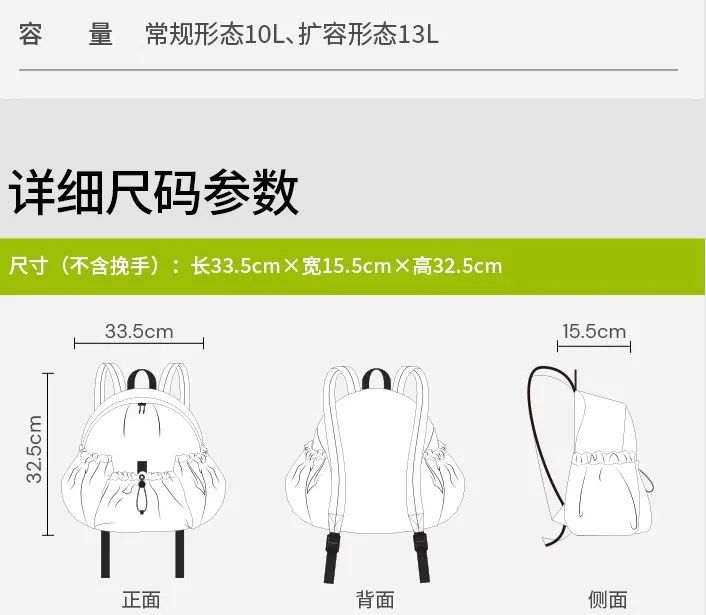 扩容形态可达13L,平时通勤上下班:可以把随身的手机、钥匙、电脑等装里面。