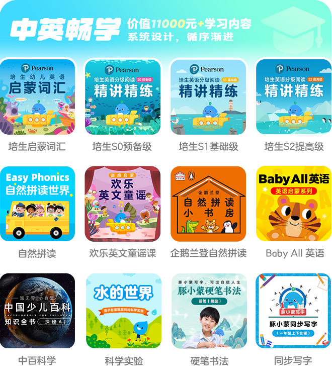 ◾全套装备:培生外教AI课(课程)+培生阅读分级(图书)+豚小蒙/小鸡球球/小猴皮皮点读笔(工具)