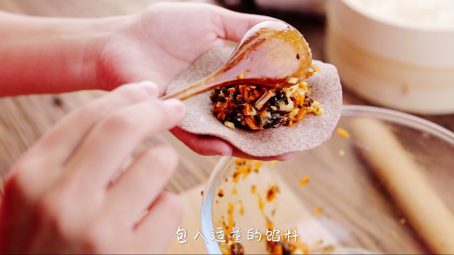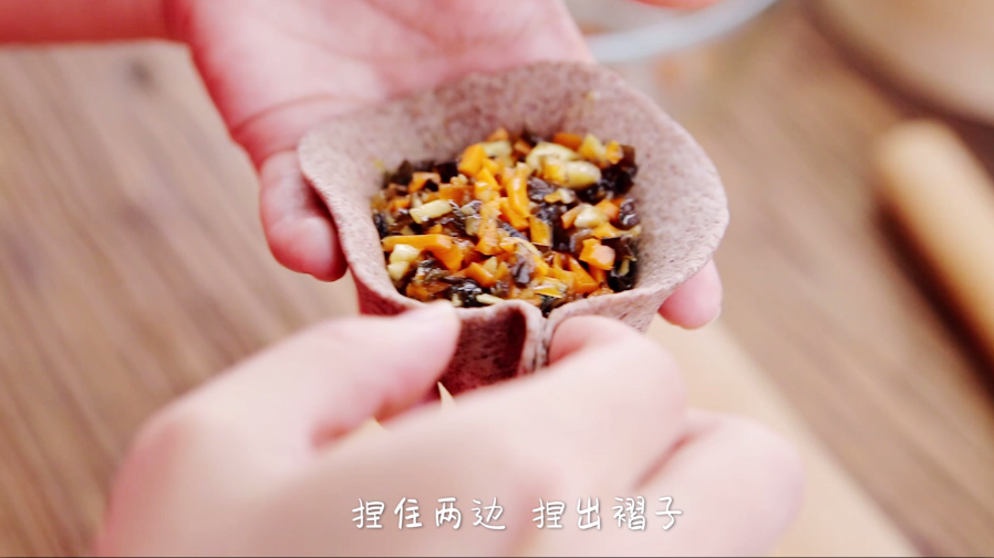 包入适量的馅料,捏住两边,捏出褶子