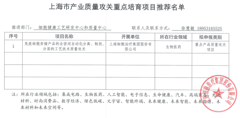 7月 上海细胞治疗集团的《免疫细胞存储产品的全密闭自动化分离、制剂、分装的工艺技术质量攻关》项目被推荐为“上海市产业质量攻关重点培育项目”。 | ![]() |