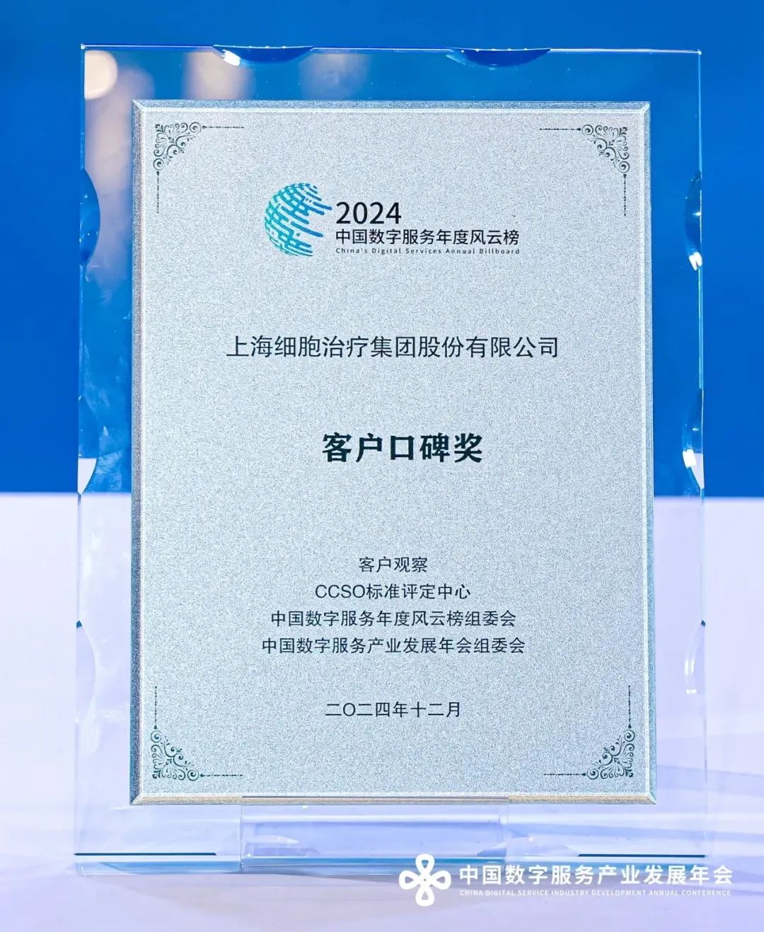 ![]() | 12月 上海细胞治疗集团荣获第九届中国数字服务产业发展年会“客户口碑奖”。 |