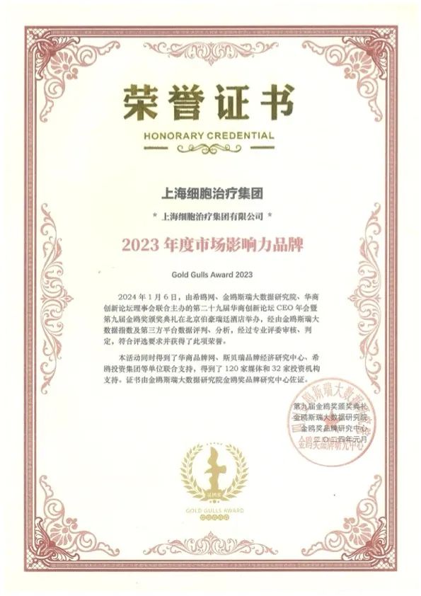 ![]() | 1月 上海细胞治疗集团荣获第九届金鸥奖最具市场影响力品牌奖。 |