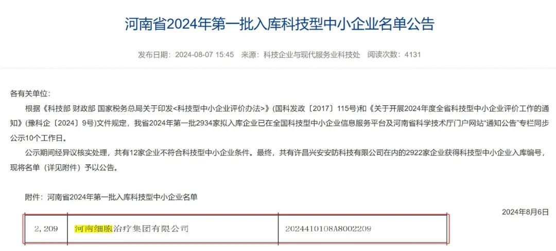 ![]() | 8月 河南细胞治疗集团入库国家科技型中小企业。 |