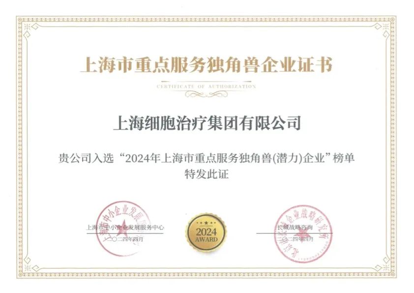 ![]() | 4月 上海细胞治疗集团荣登《2024年上海市重点服务独角兽(潜力)企业榜单》获评独角兽企业。 |