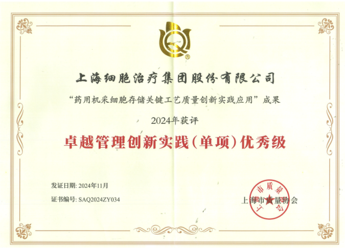 ![]() | 上海细胞治疗集团《药用机采细胞存储关键工艺质量创新实践应用》项目成果获评上海市质量协会2024年“卓越管理创新实践(单项)优秀级。 |