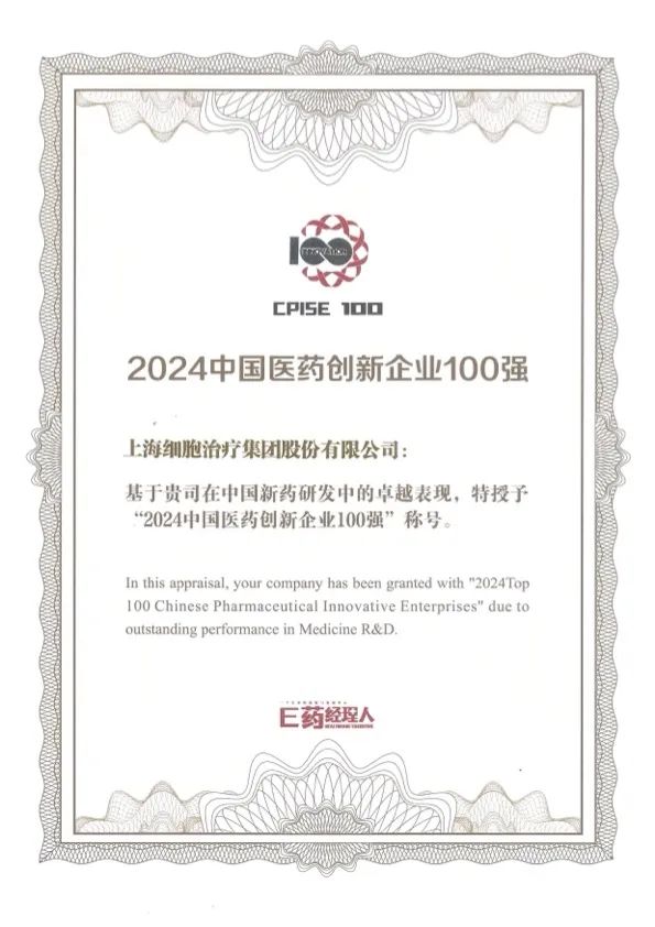 ![]() 上海细胞治疗集团上榜“2024中国医药创新企业技术赛道——基因及细胞治疗(CGT) Top5”。 | 11月 上海细胞治疗集团连续第三年上榜“2024中国医药创新企业100强”榜单。 ![]() |