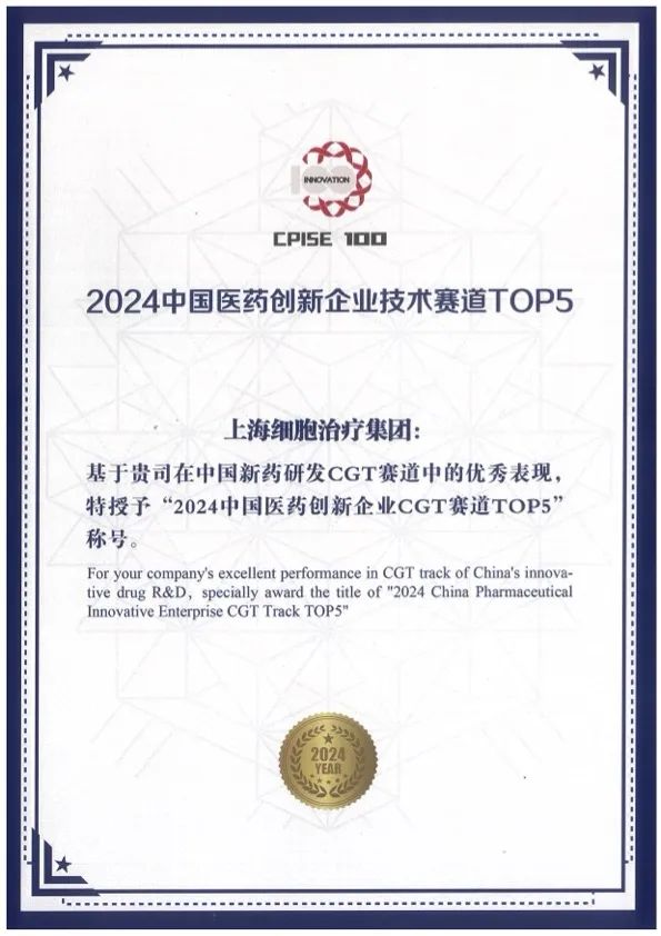 2024年,上海细胞治疗集团获批国家专精特新“小巨人”企业;荣登“华医榜·2024中国生物医药科技创新价值榜·最具影响力细胞基因治疗企业top10”榜单;连续三年上榜“2024中国医药创新企业100强”榜单及“2024中国医药创新企业技术赛道TOP5”榜单中基因及细胞治疗(CGT)领域Top5。
