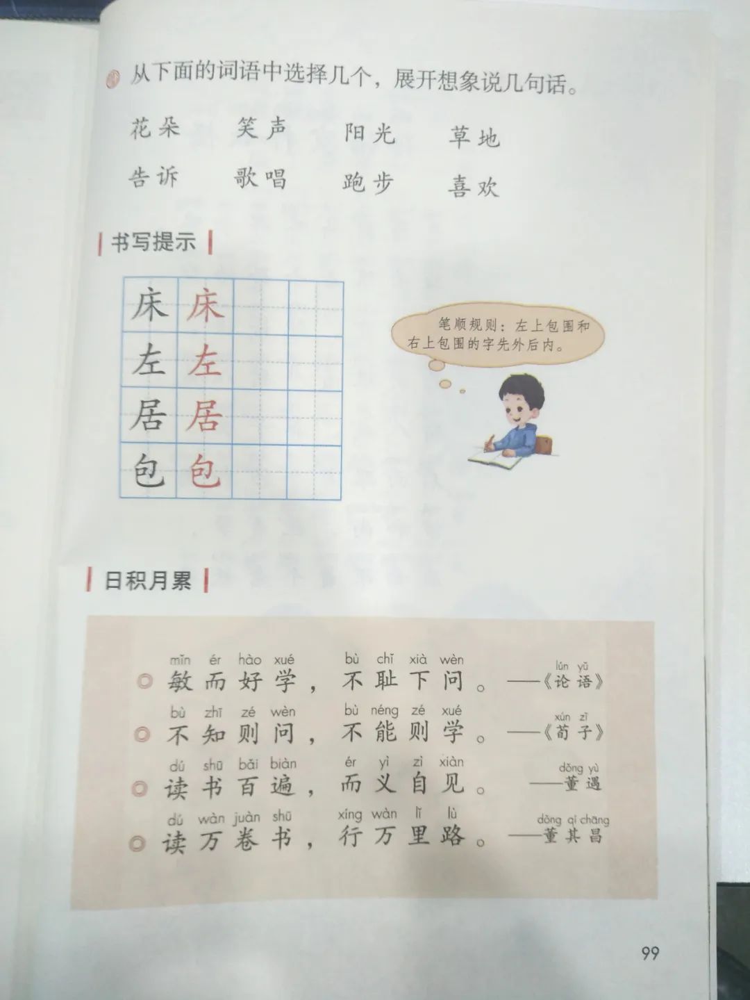 另一方面,大量增加古诗文,细心的家长会发现,连一年级的教材《日积月累》里都开始出现“敏而好学,不耻下问”了!