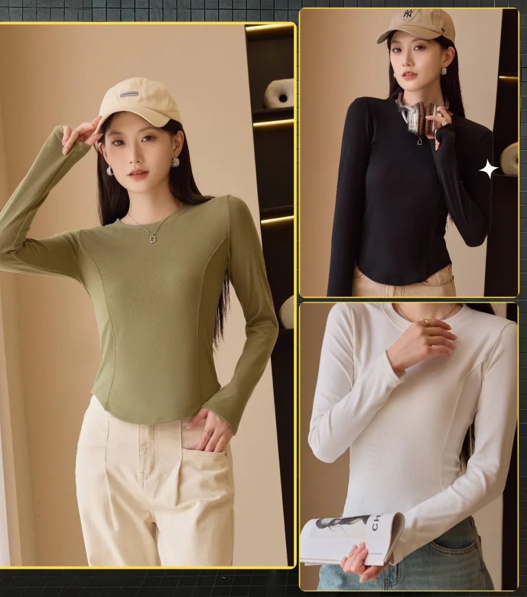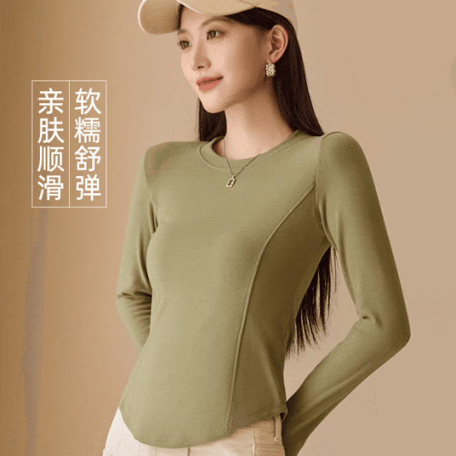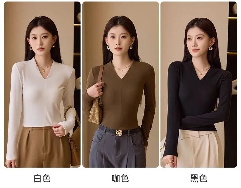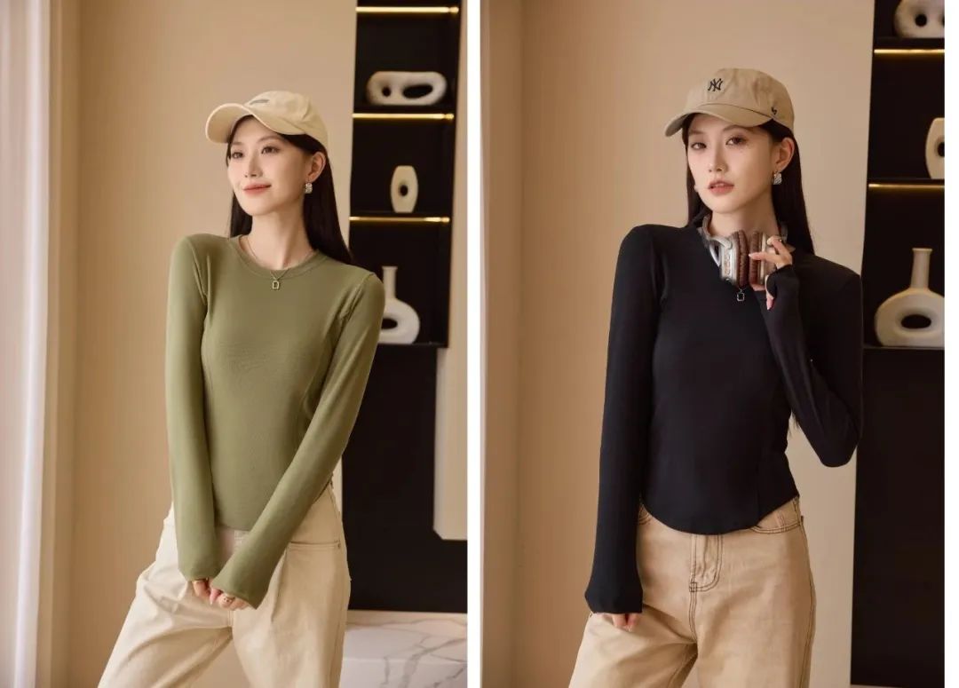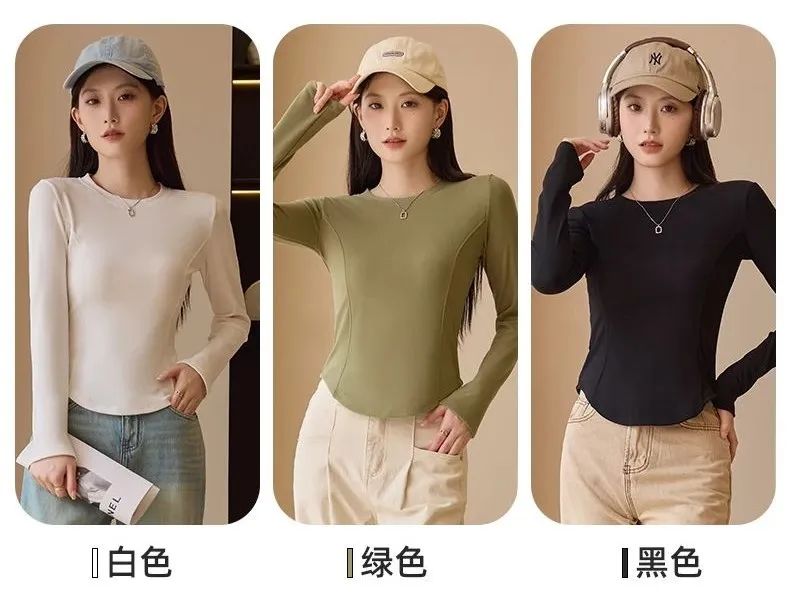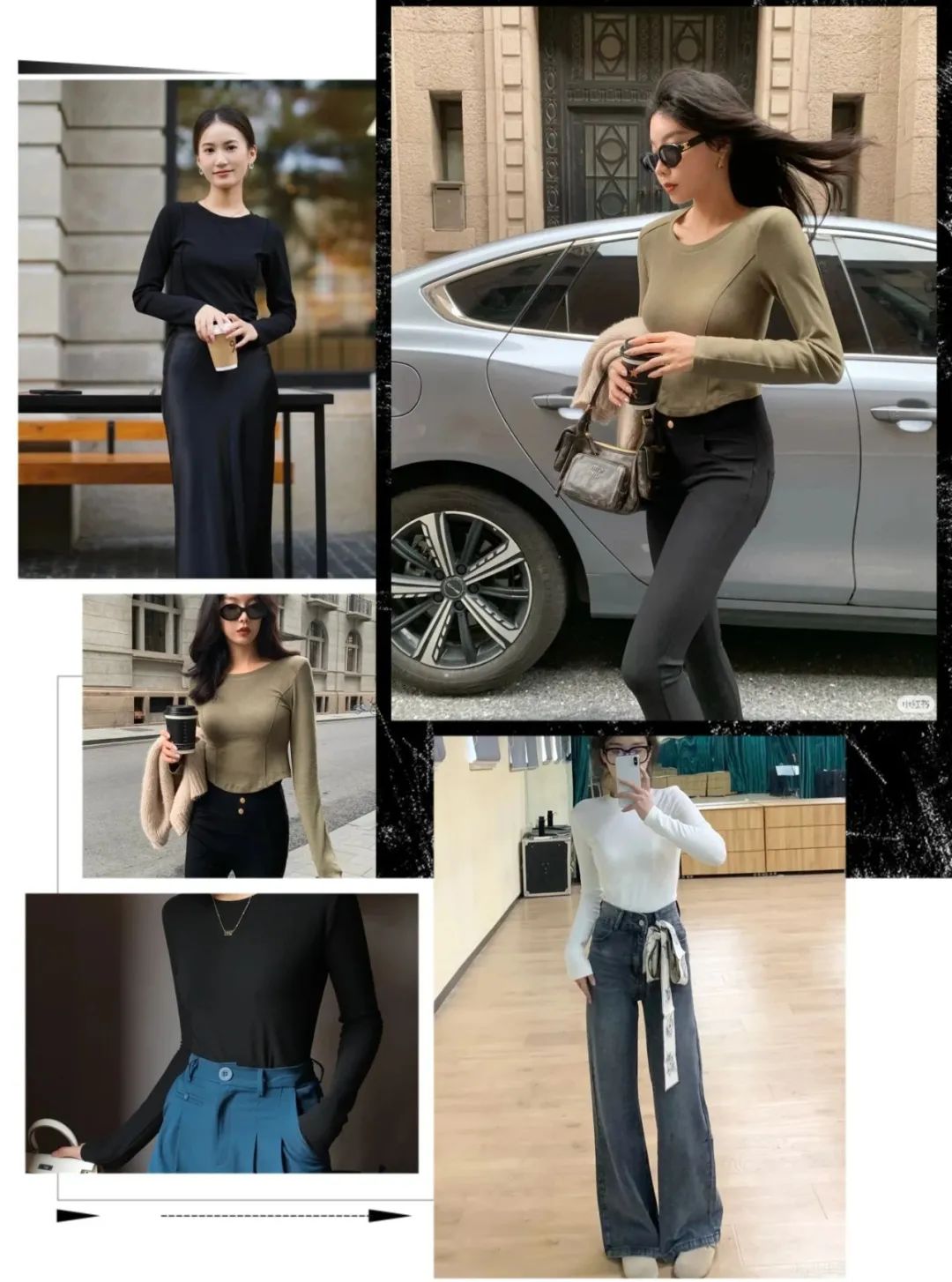 这个圆领设计得恰到好处,不会太高勒脖子,也不存在太低暴露走光。非常经典百搭,还能修饰颈部线条,甭管什么身材脸型,买它就对了!和V领不同的是,这款上衣多了两侧的鱼骨设计,遮肉效果直接翻倍。巧妙包容多种身材,肩宽、麒麟臂、小粗腰等都可以“瘦瘦瘦”!无论是正面、侧面还是背面,视觉上都给人“小了一圈”的既视感。我们将它和普通打底衫上身测试对比,区别竟然如此之大:肩部小了,腰围小了,整个人像缩水了一圈,这显瘦效果,简直是打底衫界的天花板!都是经典的百搭色,穿上满满的韩式酷辣风,city到不行~百褶裙、短裙、阔腿裤、牛仔裤、紧身裤,甭管是什么下装,随便穿都好看!