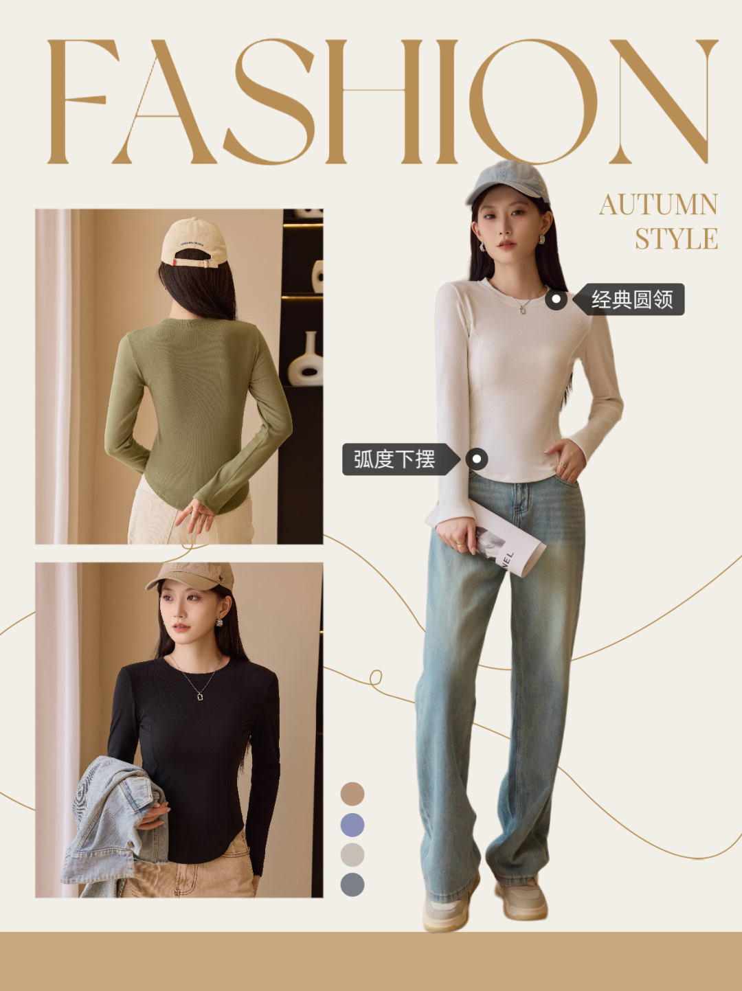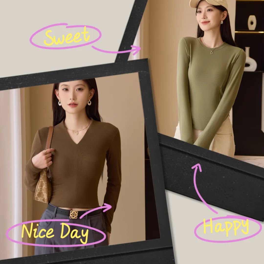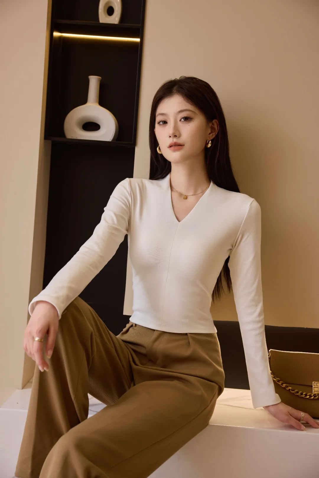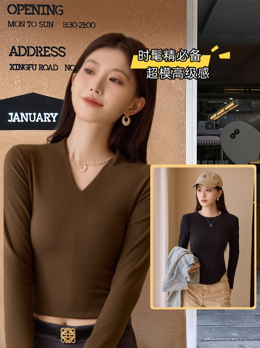 这个圆领设计得恰到好处,不会太高勒脖子,也不存在太低暴露走光。非常经典百搭,还能修饰颈部线条,甭管什么身材脸型,买它就对了!和V领不同的是,这款上衣多了两侧的鱼骨设计,遮肉效果直接翻倍。巧妙包容多种身材,肩宽、麒麟臂、小粗腰等都可以“瘦瘦瘦”!无论是正面、侧面还是背面,视觉上都给人“小了一圈”的既视感。我们将它和普通打底衫上身测试对比,区别竟然如此之大:肩部小了,腰围小了,整个人像缩水了一圈,这显瘦效果,简直是打底衫界的天花板!都是经典的百搭色,穿上满满的韩式酷辣风,city到不行~百褶裙、短裙、阔腿裤、牛仔裤、紧身裤,甭管是什么下装,随便穿都好看!