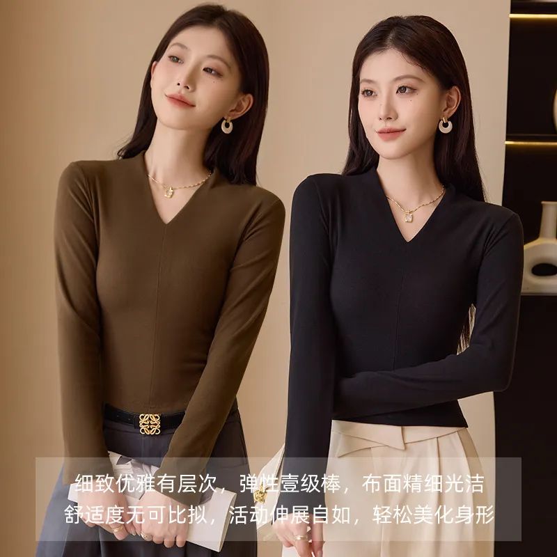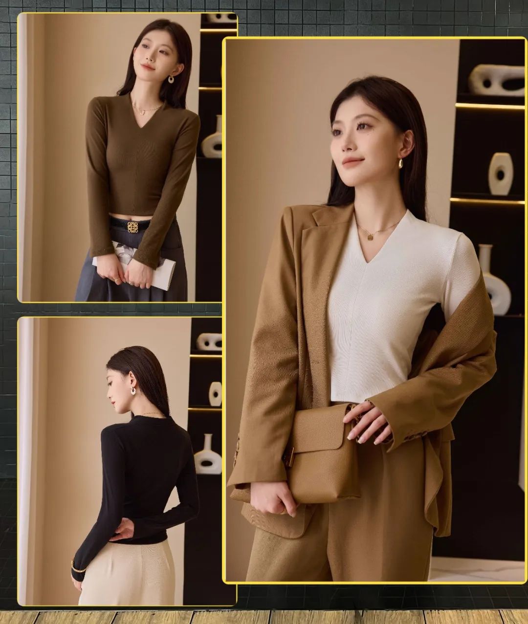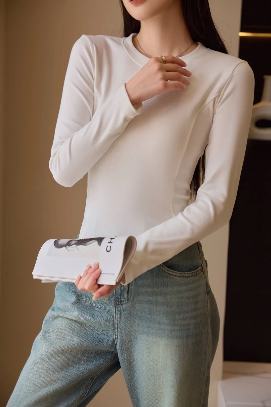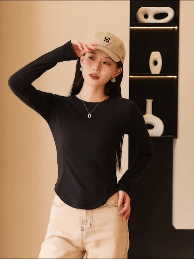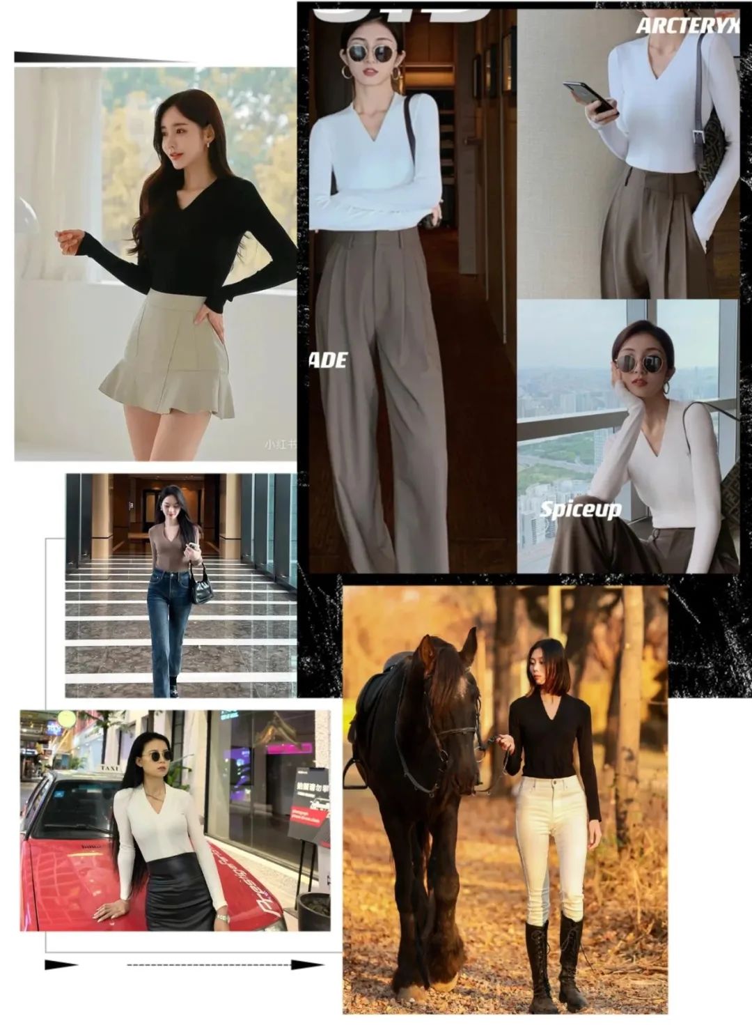 这个圆领设计得恰到好处,不会太高勒脖子,也不存在太低暴露走光。非常经典百搭,还能修饰颈部线条,甭管什么身材脸型,买它就对了!和V领不同的是,这款上衣多了两侧的鱼骨设计,遮肉效果直接翻倍。巧妙包容多种身材,肩宽、麒麟臂、小粗腰等都可以“瘦瘦瘦”!无论是正面、侧面还是背面,视觉上都给人“小了一圈”的既视感。我们将它和普通打底衫上身测试对比,区别竟然如此之大:肩部小了,腰围小了,整个人像缩水了一圈,这显瘦效果,简直是打底衫界的天花板!都是经典的百搭色,穿上满满的韩式酷辣风,city到不行~百褶裙、短裙、阔腿裤、牛仔裤、紧身裤,甭管是什么下装,随便穿都好看!