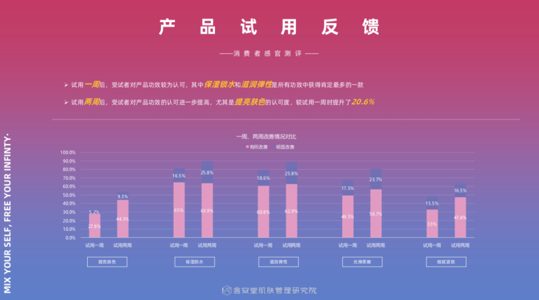 88.7%的测试者认为滋润弹性得到改善,25.8%认为得到明显改善