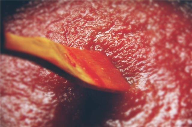 2、西红柿小丁都化开了,锅中的酱汁变的浓稠,关火,放2勺糯米白醋,搅拌均匀,装瓶拧盖,口朝下静置24小时,就做好了!